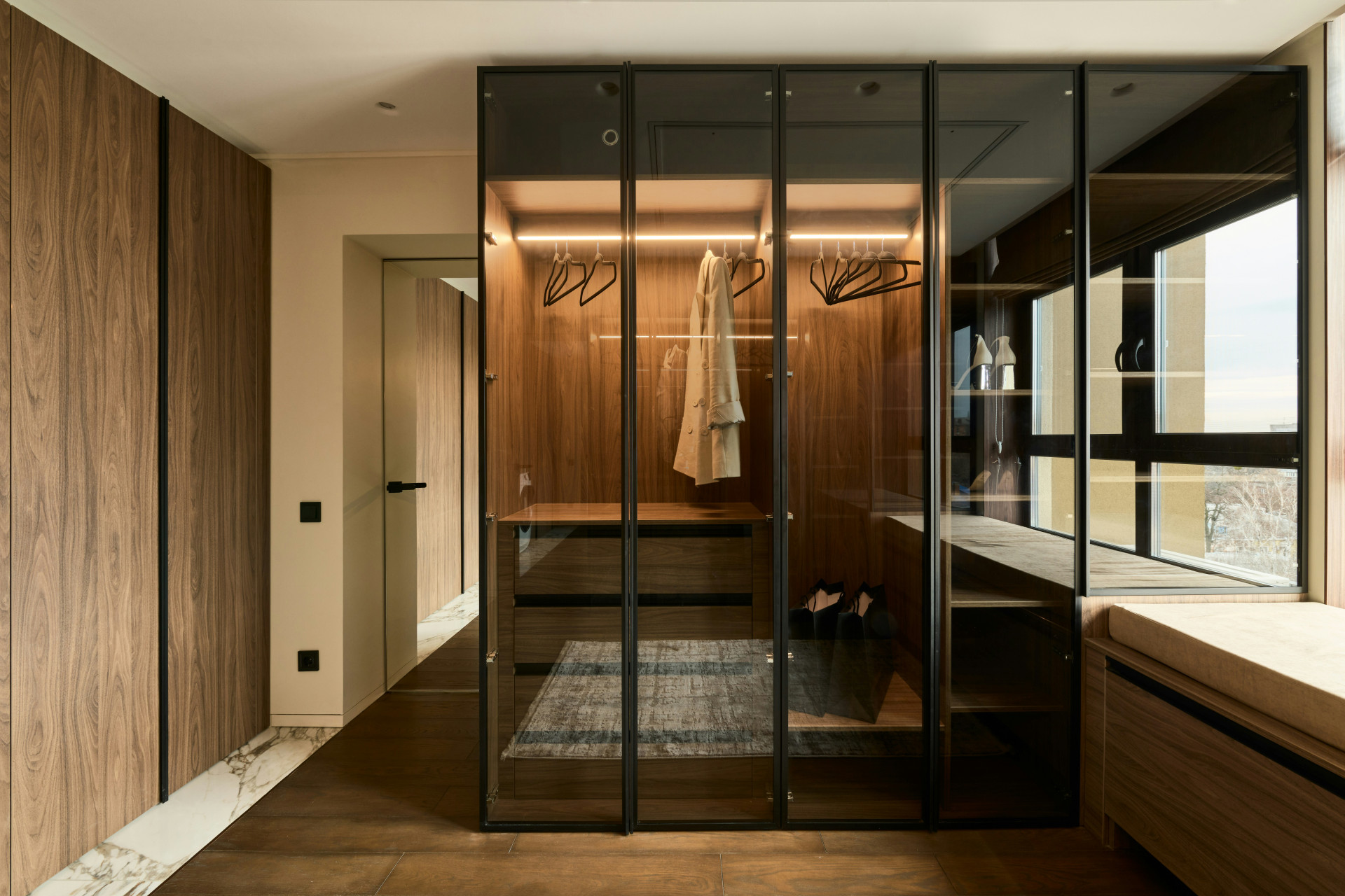 Glas skapar en känsla av öppenhet och kan användas på många sätt i garderoben. Det släpper igenom ljus och gör att även en kompakt förvaring känns luftig.